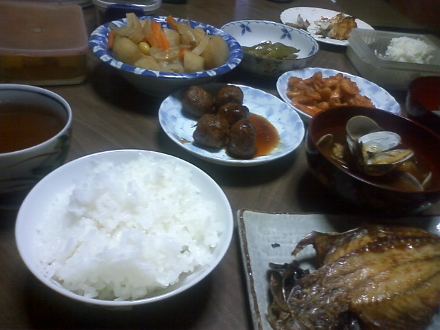 今日は、白米、あじの開き、あさりのみそ汁、肉団子、エビのから揚げ、じゃが、焼ピーマン