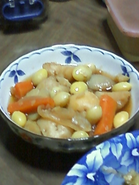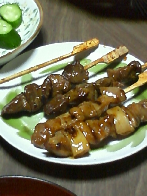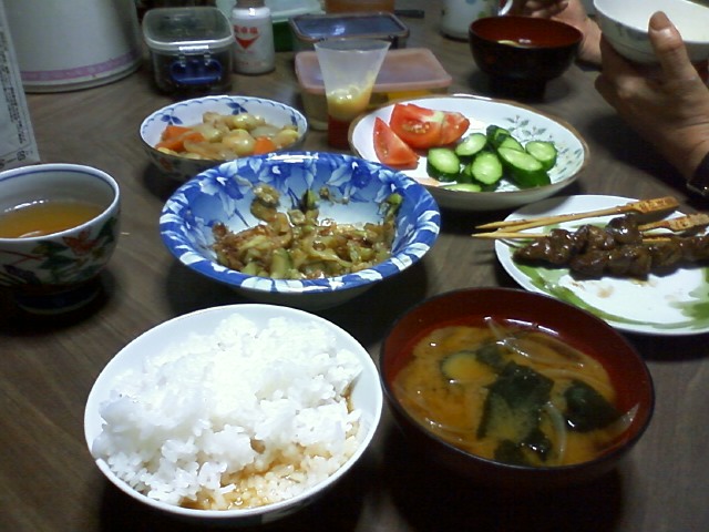 今日は、玉子ごはん、みそ汁、やきとり、なすの塩もみ、じゃが&ぎんなん、野菜