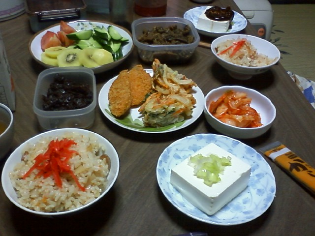 今日のごはんは、炊き込みご飯、冷奴、揚げ物2種、キムチ、貝の佃煮、サラダ、ゴーヤのミソ和え