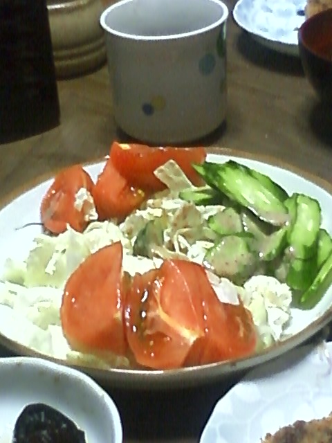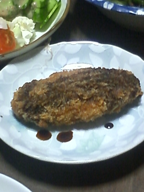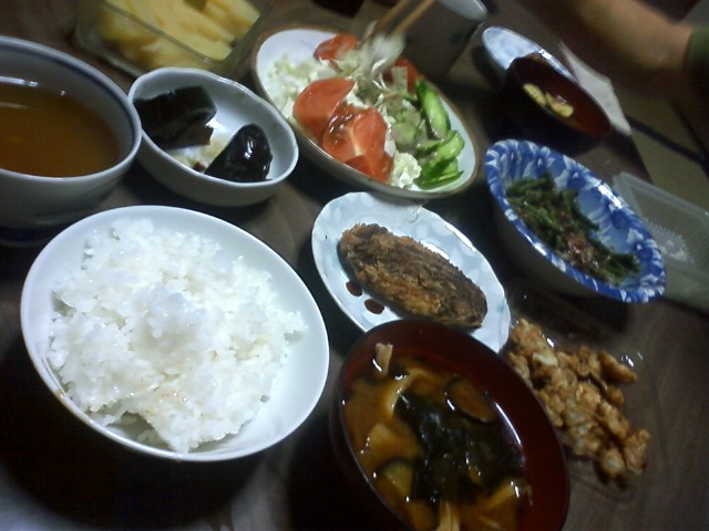 そんな事とは全く関係ない今日のごはんは、白米、みそ汁、コーンコロッケ、いか入り練物系、昆布巻き、野菜、じゅうろく(?)