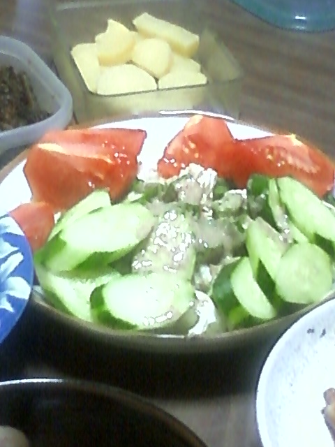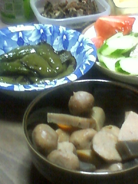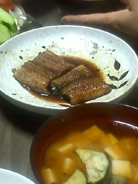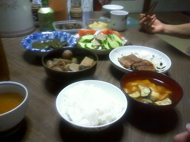 さてさて今日は、白米、うなぎ、みそ汁、芋とかの煮物、ピーマン炒め、サラダ