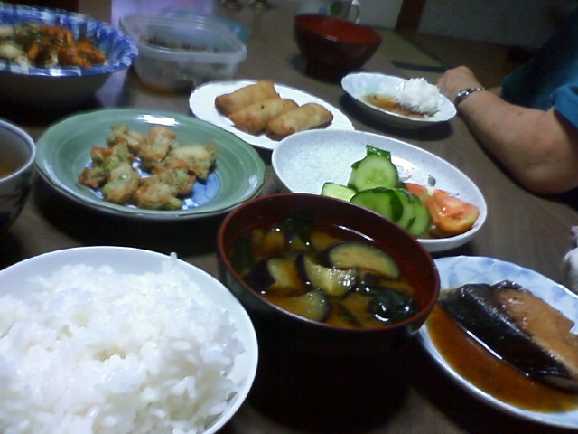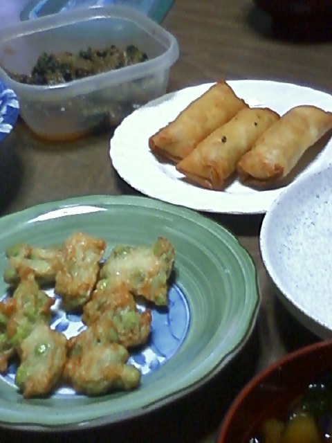 そんな今日のごはんは、白米、みそ汁、ぶりの照焼き、豆天、春巻き、野菜である。