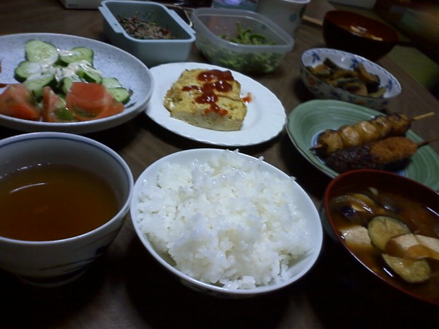 今日のごはんは、白米、みそ汁、玉子焼き、ゴーヤの何かしら、野菜、味噌カツ、みたらし団子