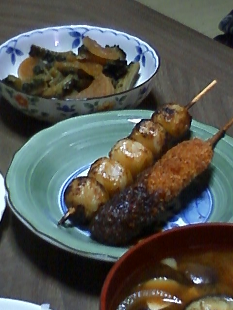 味噌カツとみたらし団子、うしろはゴーヤの何かしら