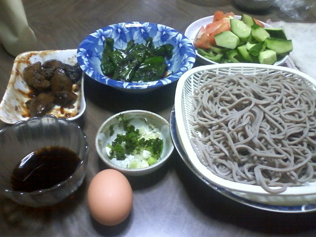 そんな今日の昼ごはんは、ざるソバ、ゆで卵、野菜、レバー、ピーマン炒め