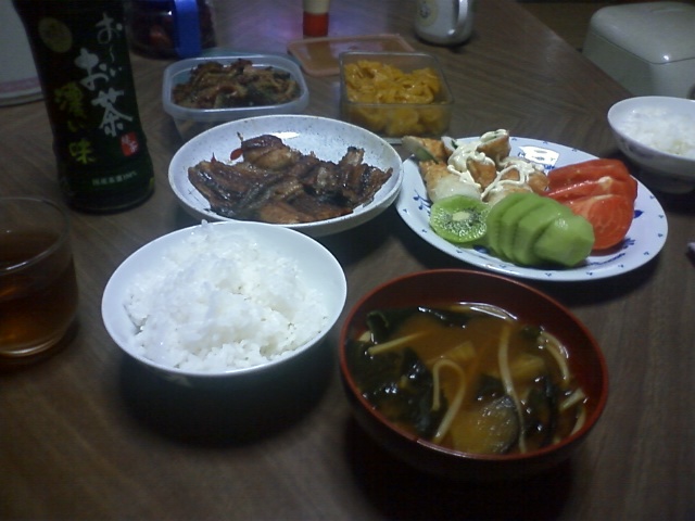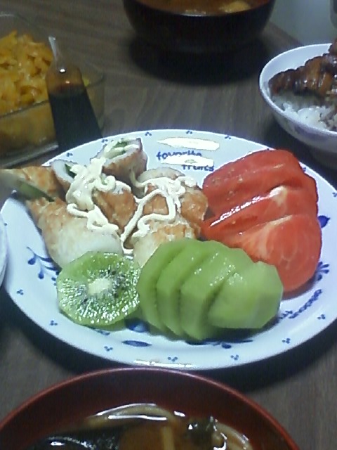 今日は、白米、うなぎの蒲焼、みそ汁、ちくわ、トマト、キウイ、ゴーヤの何か、漬け物