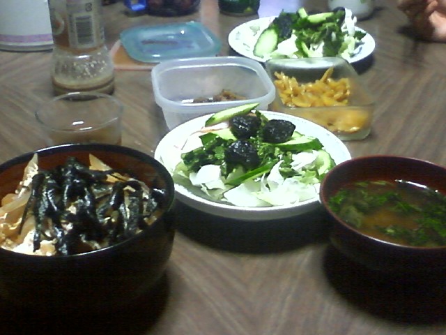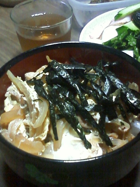 今日は、親子丼、みそ汁、サラダ、昨日の残り