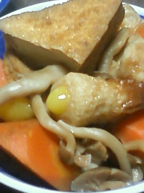 厚揚げとしめじとちくわとにんじんとぎんなんをまとめました。