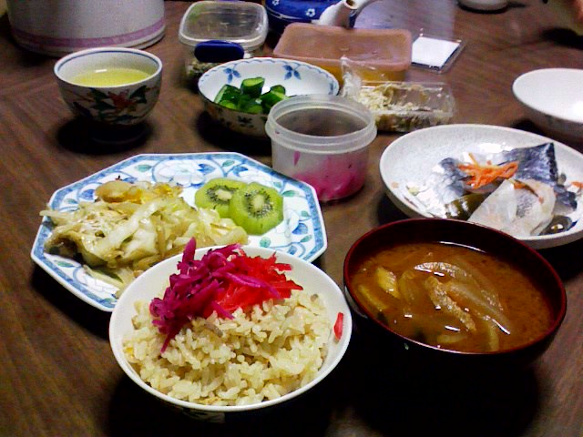 今日は、昨日と同じ炊き込みご飯、みそ汁、切干大根、揚げ物ハーフ&ハーフ、サラダ
