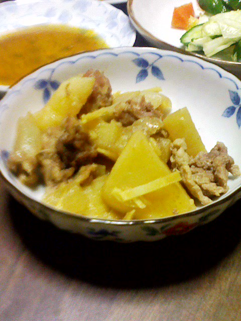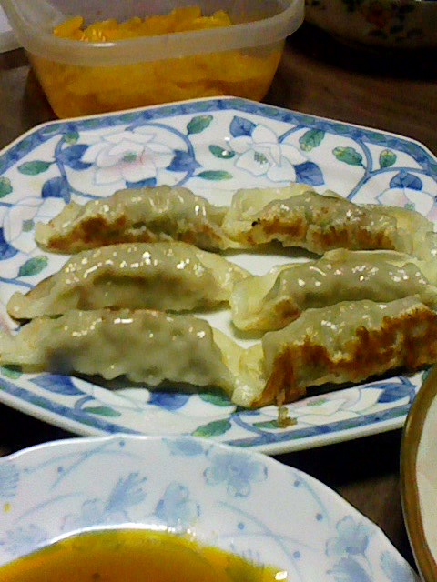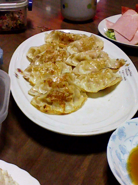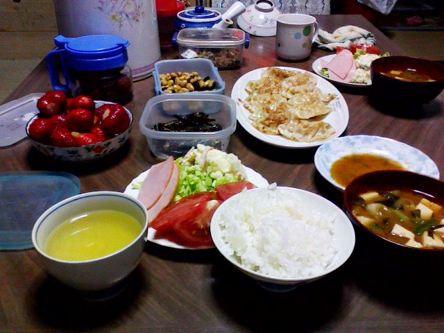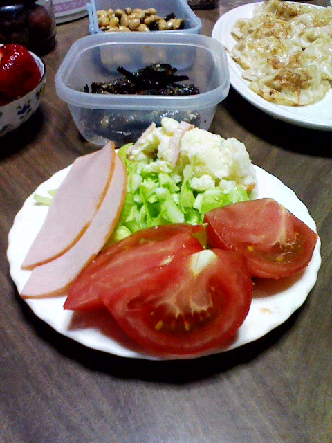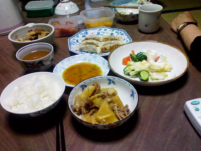今日は、ごはん、肉じゃが、餃子、たけのこ(ぎんなんがいなくなってた)、野菜盛り、明太子、ツボ漬け