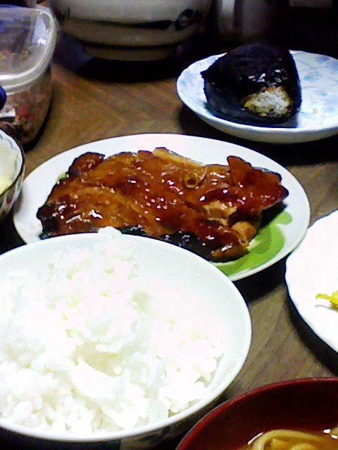ごはん、冷麦入りみそ汁、鳥のテリヤキ、玉子焼き、漬け盛り、そしておにぎり・・・出た!