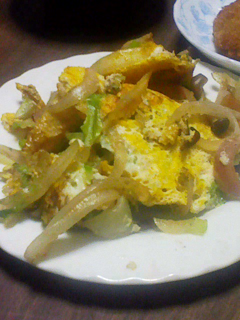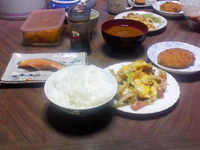 今日は、卵ごはん、みそ汁、焼き鮭、野菜炒めの卵とじ