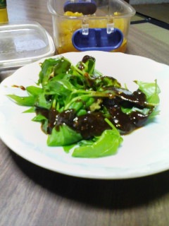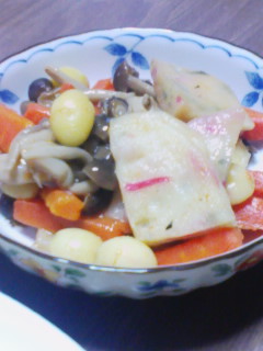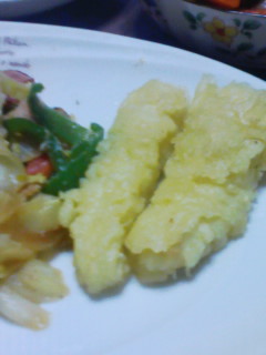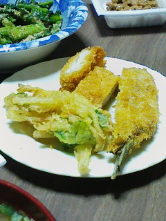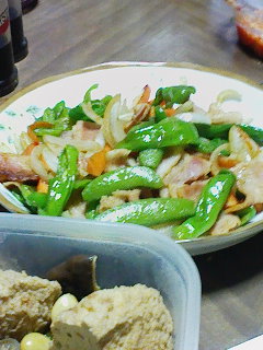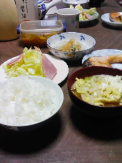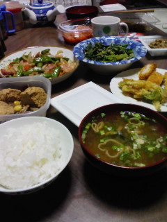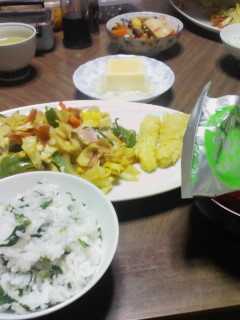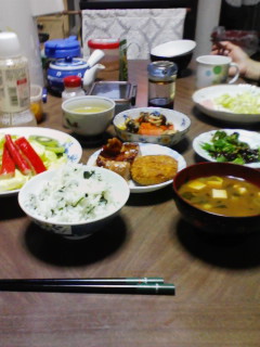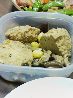 今日は、また菜めし、みそ汁、コロッケ、テリヤキ2キレ、葉っぱ、サラダ、ハンペンとかきのことかぎんなんとかまぜて煮込んだなにか