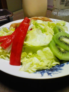 よめが許せんサラダ(今日は生キャベツ、ハム、カニカマ、キウイ)