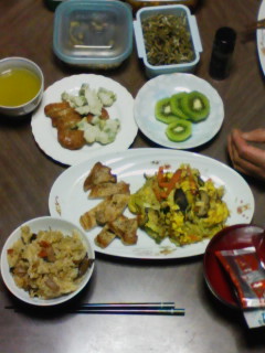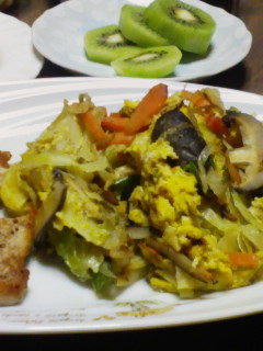 今日は、昨日と同じ炊き込みご飯、はんぺん2種、インスタントのみそ汁、焼いた豚肉、野菜炒めの卵がらめ?(なんと呼ぶのだ?)、キウイ