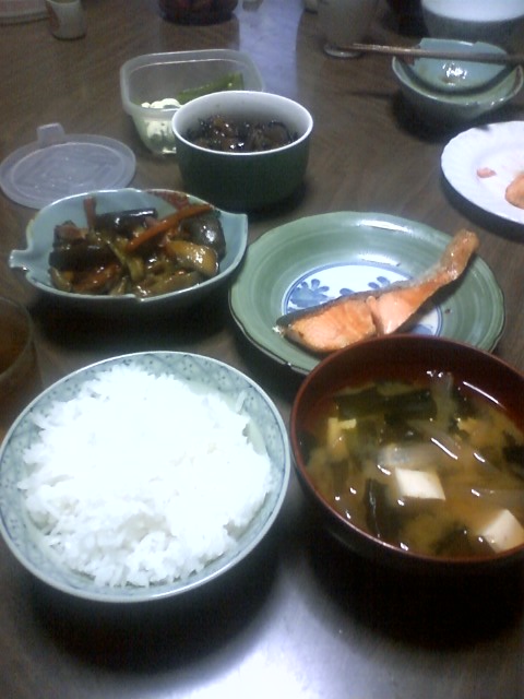 白米、味噌汁、マーボーナス、鮭、スナックエンドウ