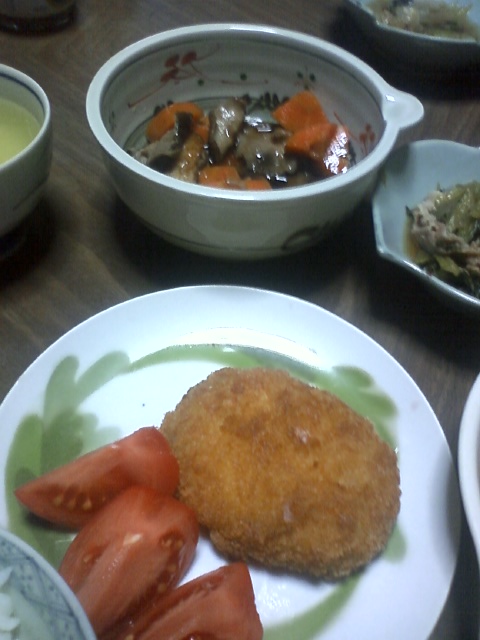 コロッケ、トマト、ニンジンとしいたけの煮物