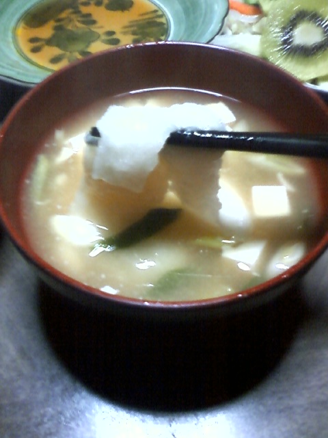 今日のごはんは、白米、みそ汁、メンチカツ、辛~いこんにゃく、わかめ、野菜炒め