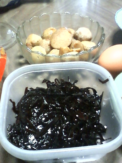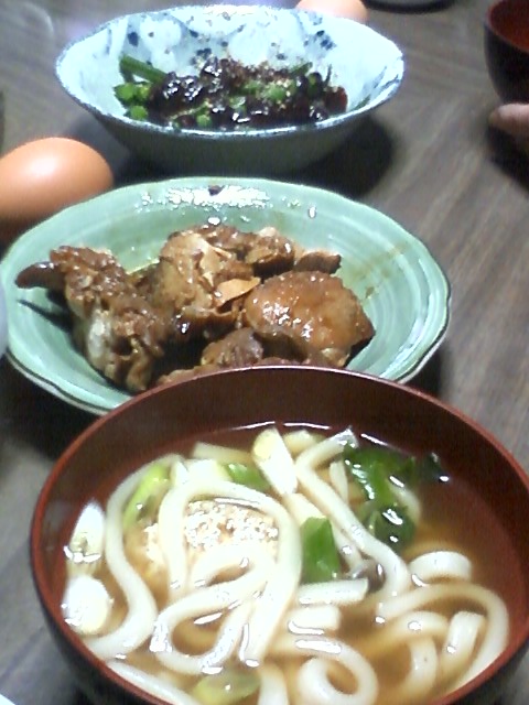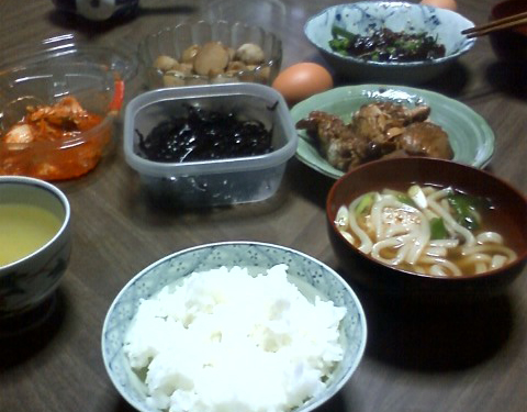 今日のごはんは、白米、うどん、照焼きチキン、芋の煮っ転がし、昆布の佃煮、ゆで卵、キムチ、じゅうろく