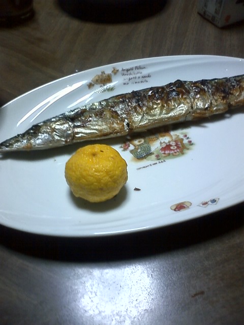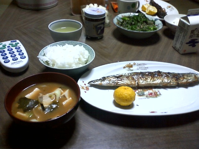 今日の昼ご飯は、白米、さんま、みそ汁、ほうれん草、お漬物