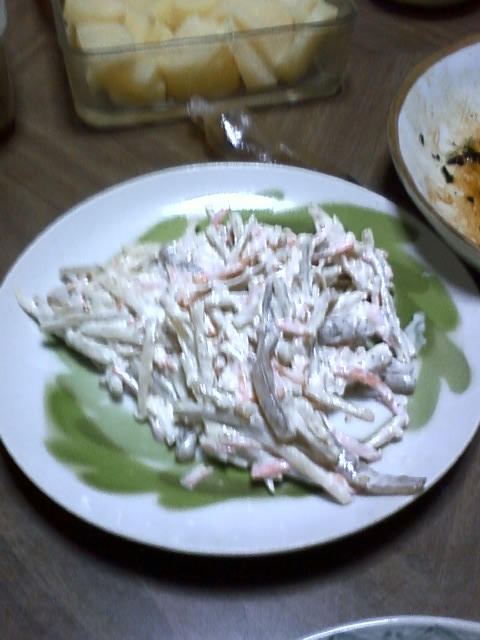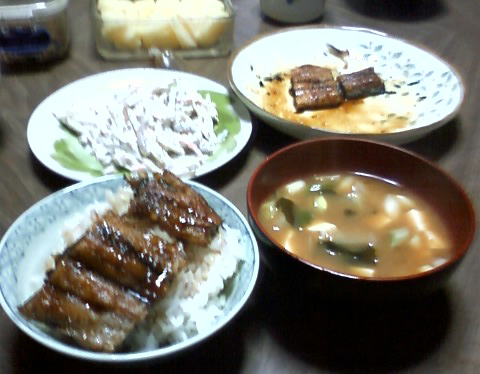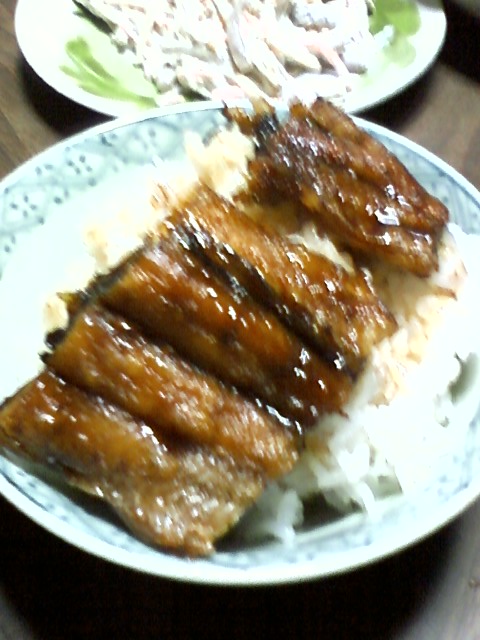 今日の昼ごはんは、うなぎ、ごはん、みそ汁、ごぼうサラダ