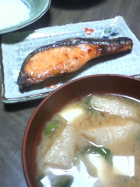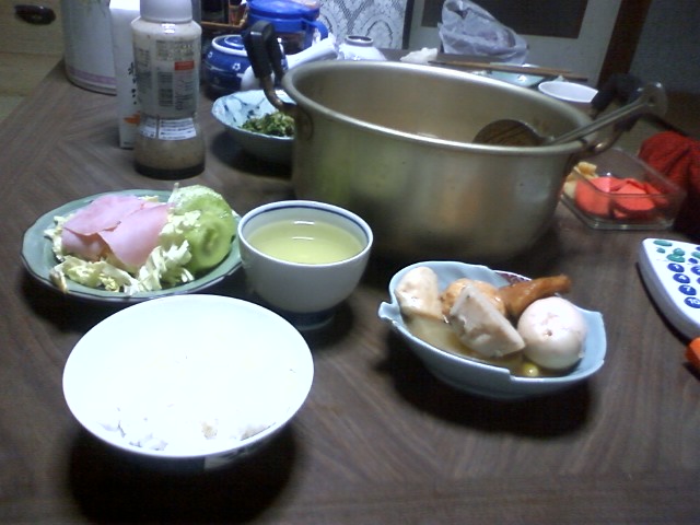 体調もだいぶん復活した今日の昼ご飯は、白米、みそ汁、魚の煮付け、おでんの残り、サラダ