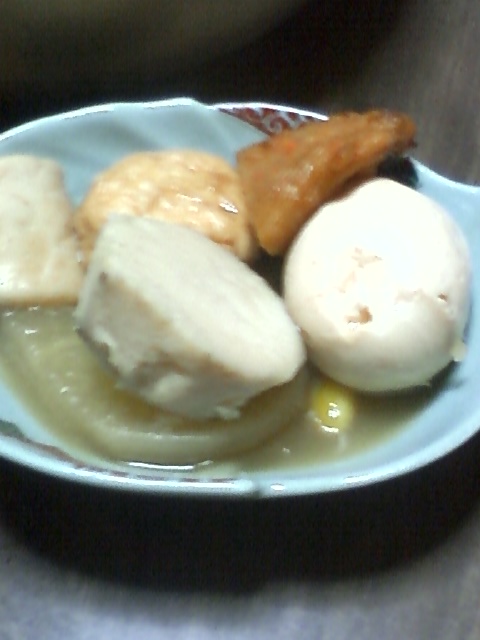 練り物各種と大根、いも、こんにゃく、ぎんなんなど入っています。