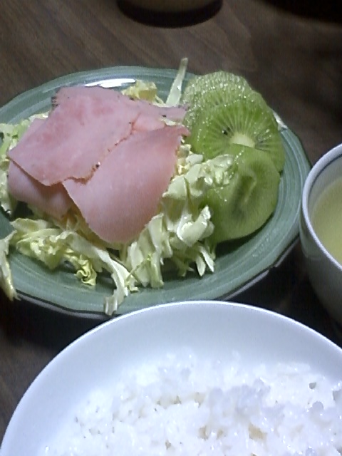 今日は、白米、うどん入りみそ汁、豚肉とネギ焼、昆布の佃煮、豆とかの煮物、ホウレン草のおひたし