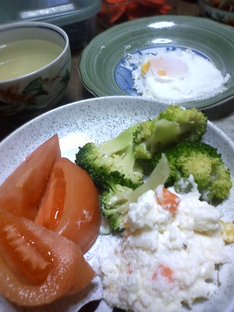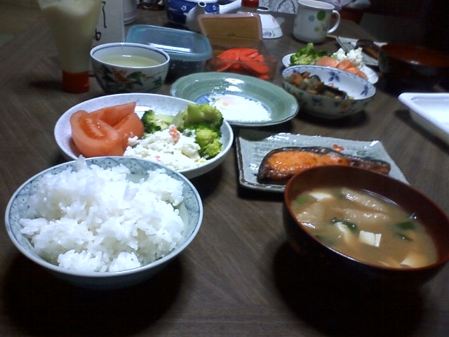 今日のごはんは、白米、みそ汁、焼き魚、サラダ、目玉焼き