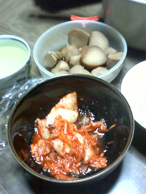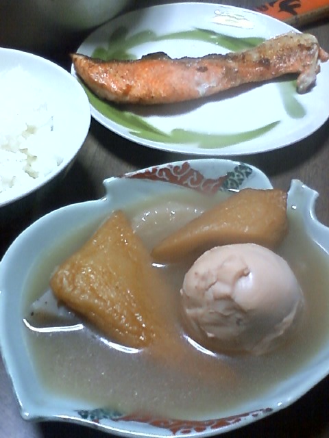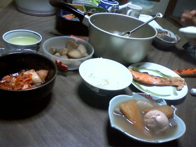 新年1発目のおかんの昼ご飯は、白米、おでん、鮭のバター焼、キムチ、おせちの残り