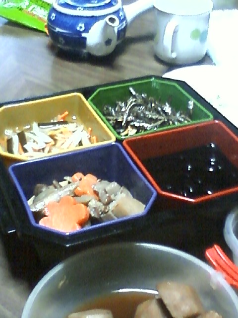 なんというのかわからんが、牛肉と野菜の煮込んだ何か、白米、サラダ、正月の残り(黒豆とたつくり)、お漬物