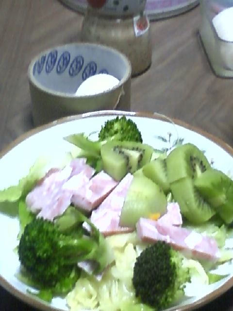 温野菜(キャベツとにんじんとブロッコリー)の上に明宝ハムとキウイ。