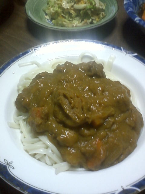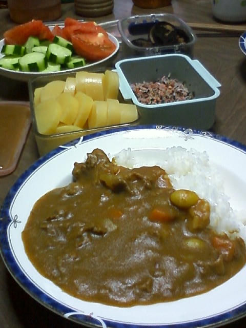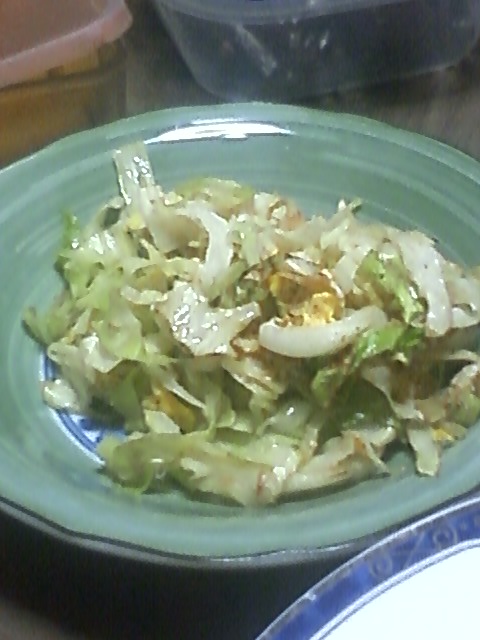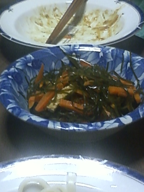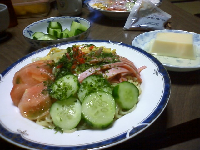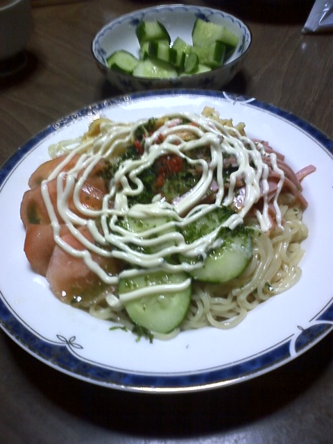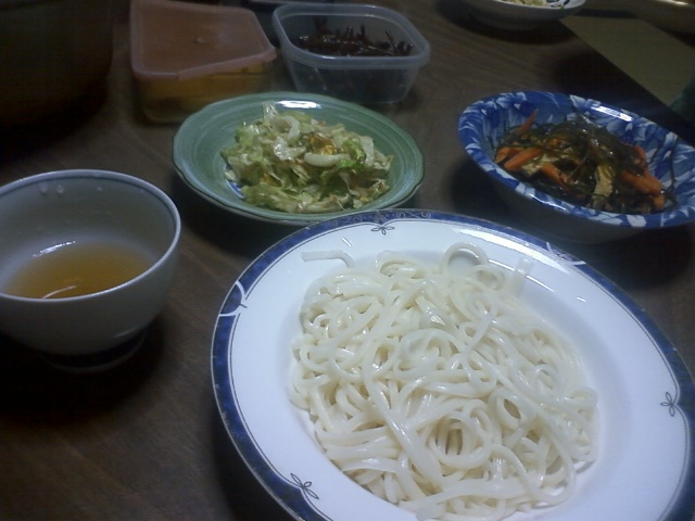 昼ごはんは、涼しげに冷麦(でもなぜか皿盛り?)、昆布のなんか煮たヤツ、野菜炒めたヤツ